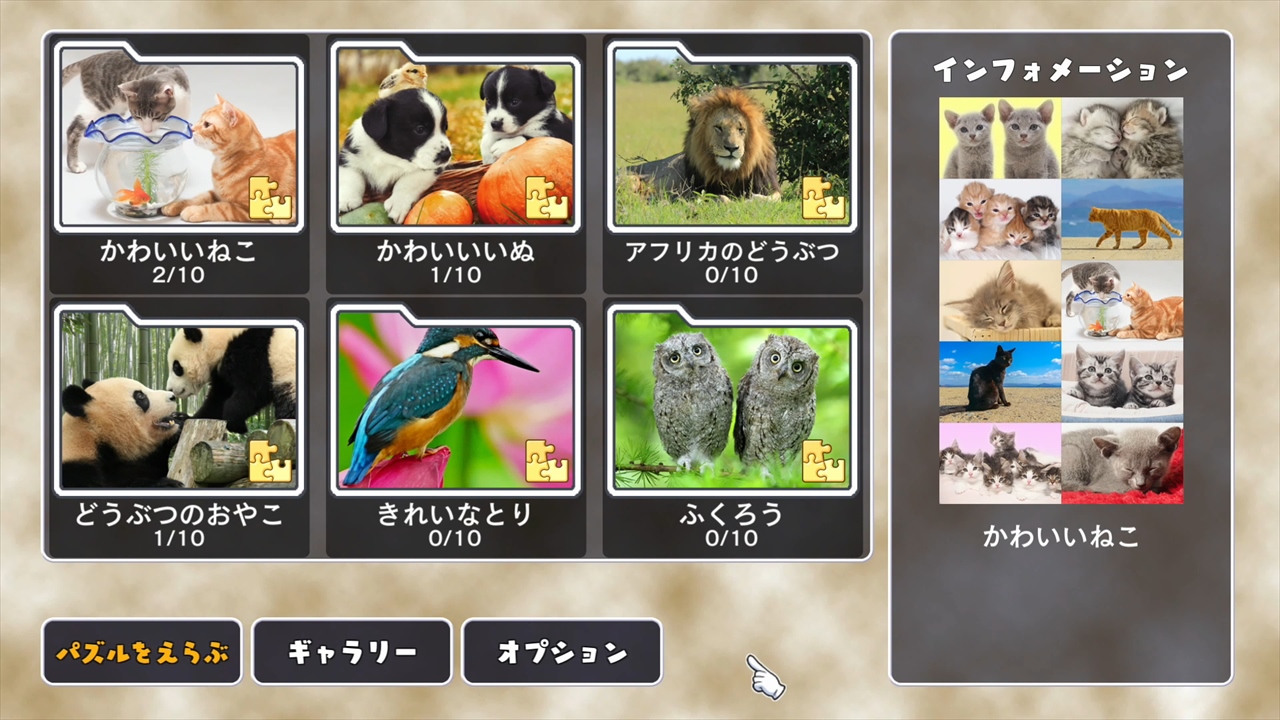 「ジグソーマスターキッズ」は子供たちのためのジグソーパズルゲームです。子猫、子犬や鳥などかわいい生き物の写真60枚で楽しく遊ぶことができます。ピースサイズはお子様用にアレンジした12から70ピースの3種類。好きな写真、好きなピース数でどこからでもはじめられます。