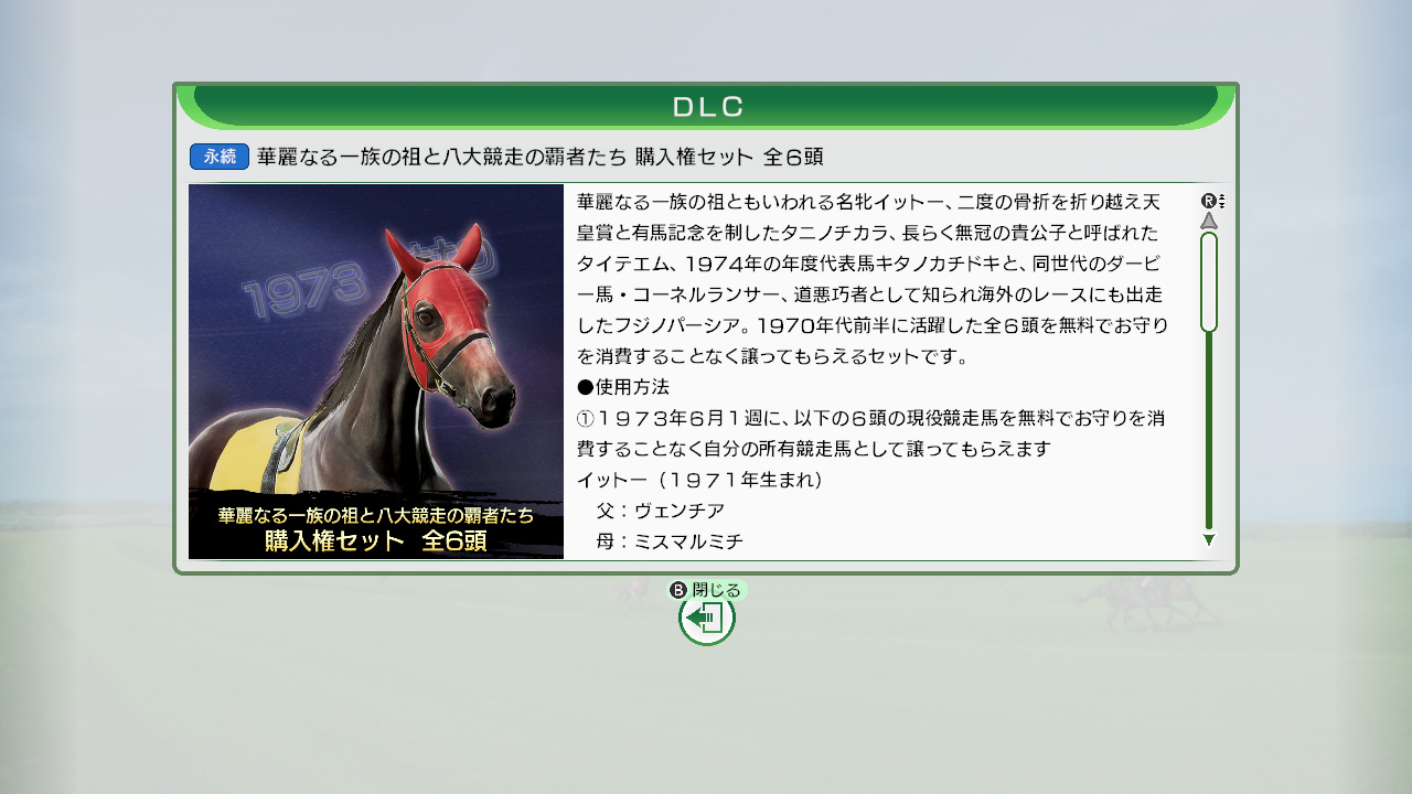 ・1973年6月1週にのみ、名馬を入手できます。その際に、これらの名馬すべてを譲ってもらうことも、好きな馬だけ選んで譲ってもらうことも可能です
